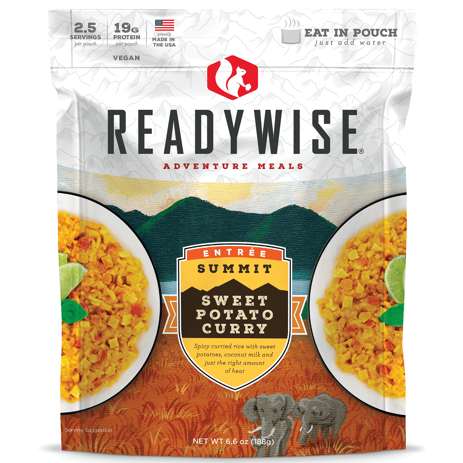 Each pouch of our Summit Sweet Potato Curry contains 2.5 servings and is resealable. These pouches are lightweight making them easily portable on any outdoor adventure. Just add water and you can eat directly from the pouch.