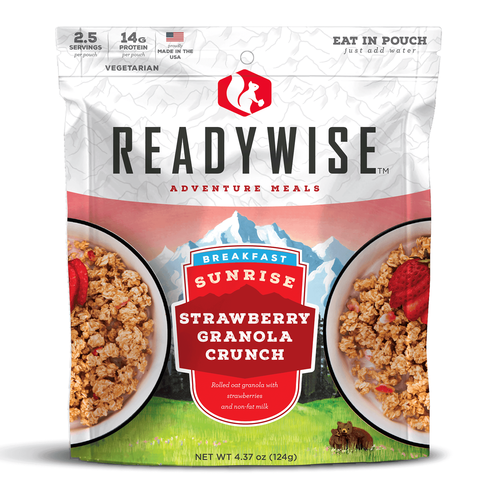 Each pouch of our Sunrise Strawberry Granola Crunch contains 2.5 servings and is resealable. These pouches are lightweight making them easily portable on any outdoor adventure. Just add water and you can eat directly from the pouch.