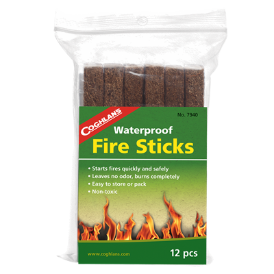 A fast, easy way to start campfires and fireplaces, these fire sticks are non-toxic, leave no odor, and burn completely. They even light after being submerged in water once dry.
