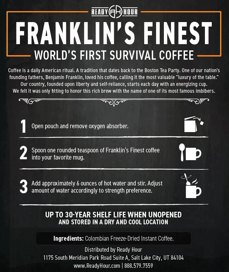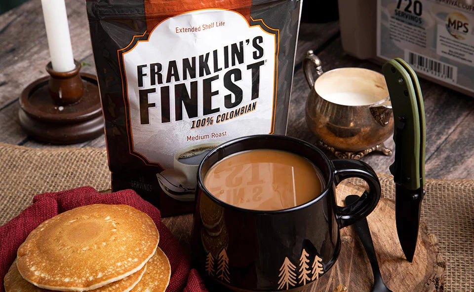 Franklin's Finest Survival Coffee is the ultimate survival perk! Should you be a daily coffee drinker you don't have to worry about going without it in an emergency or camping. Just think what you could barter and trade for this coffee pouch.. (You'll thank us for that tip later.)