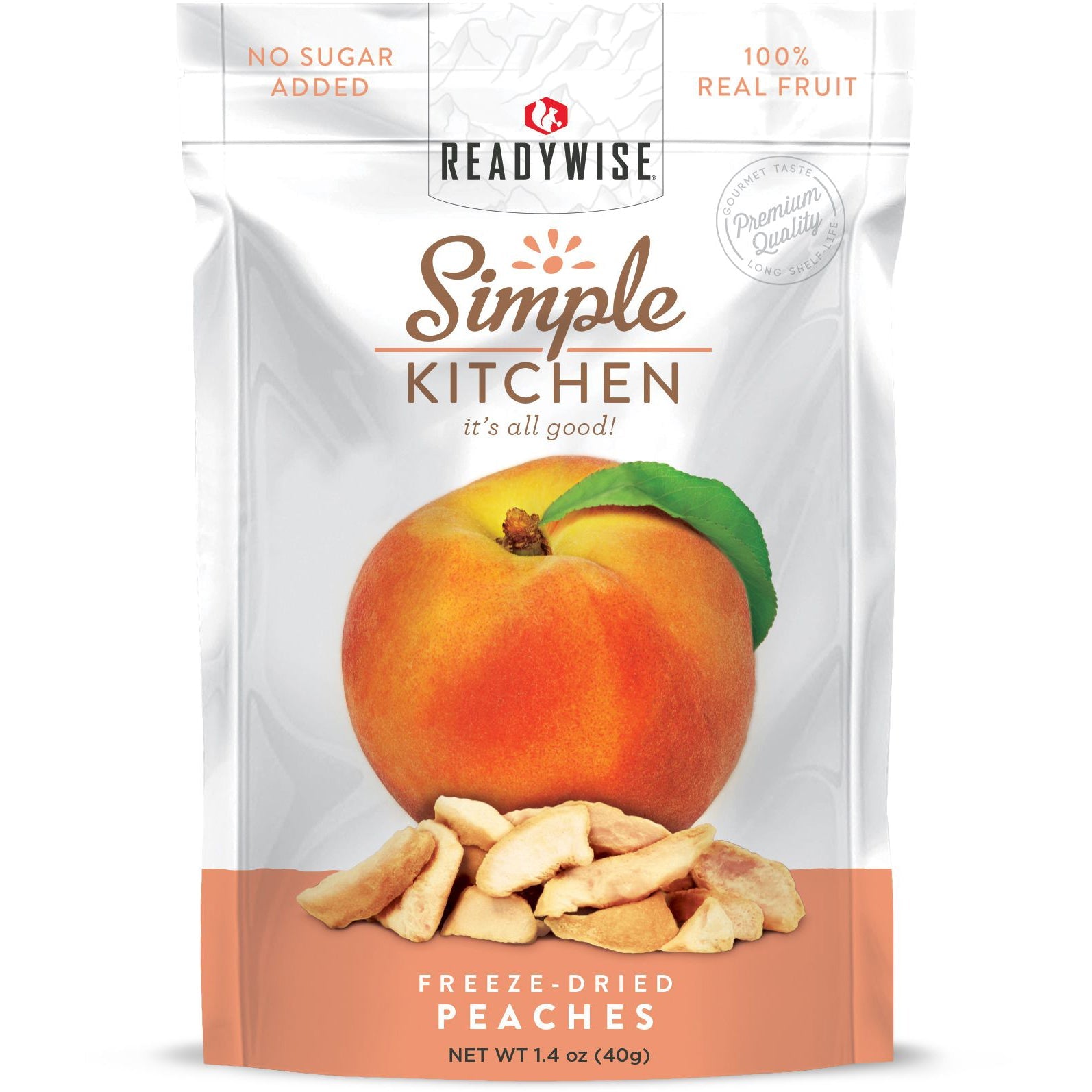 This pouch contains Simple Kitchen's (a ReadyWise Company brand) freeze-dried peaches. No fake flavors or preservatives.