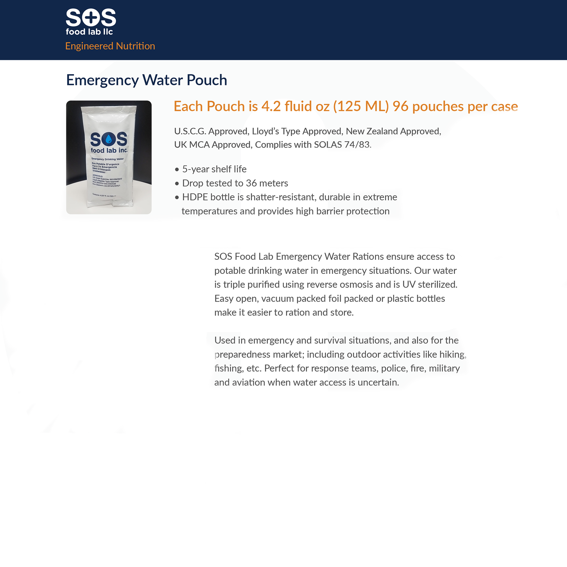 Access to potable drinking water can be a game-changer in emergency situations. Keep a safe, triple-purified supply within reach with our easy-to-open pouches. Our water is the only product on the market with both USCG and U.S. Navy approval.